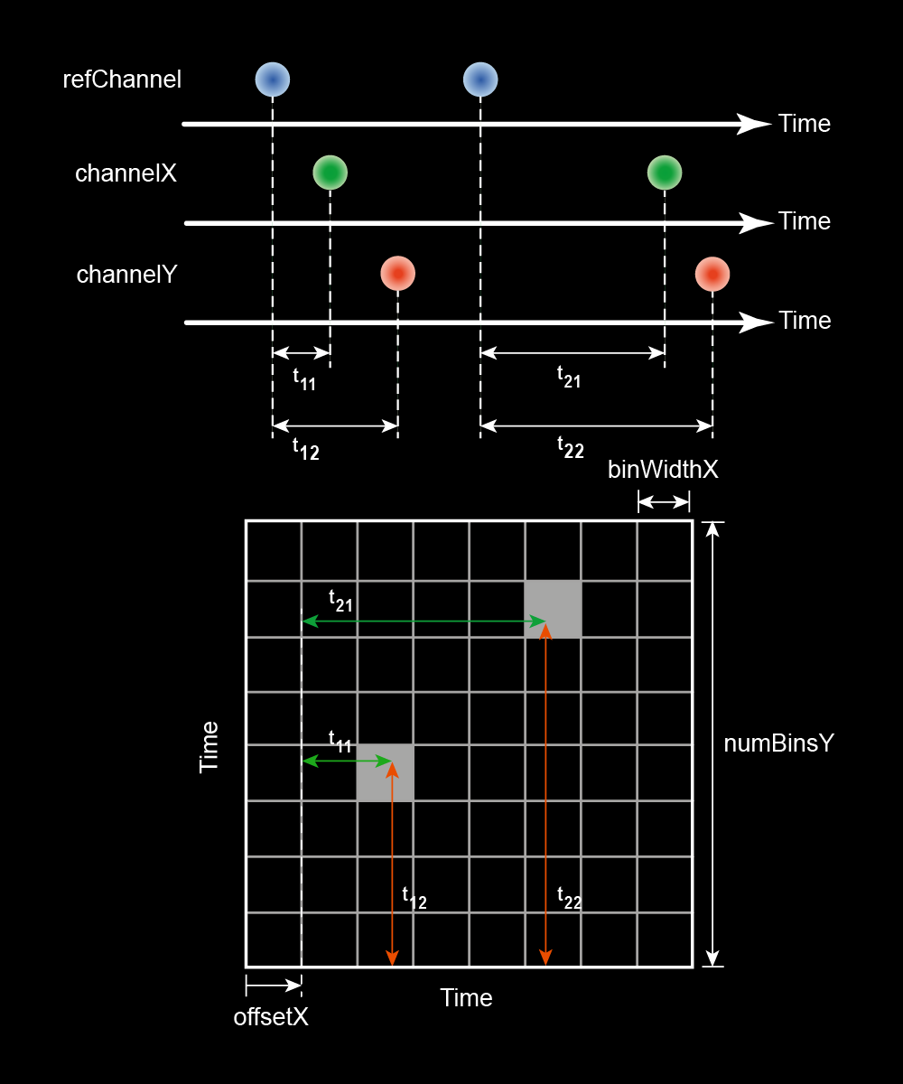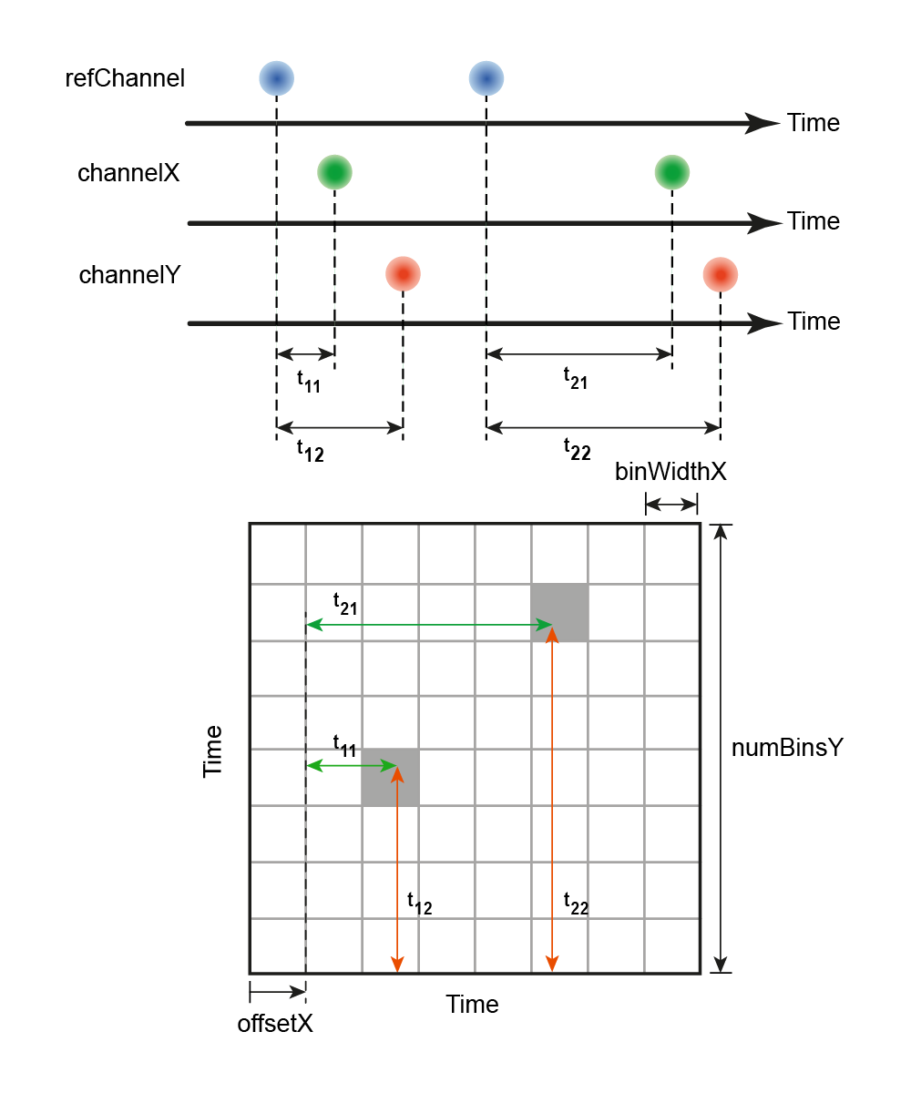 Use this manipulator whenever you need to detect coincidences between several channel pairs or groups simultaneously — for example in Bell state measurements, multi-photon experiments, or quantum key distribution, where all pairwise correlations must be recorded in a single pass over the data stream. Each virtual coincidence channel is added to the stream and can be used in downstream manipulators or measurement classes just like a physical channel.